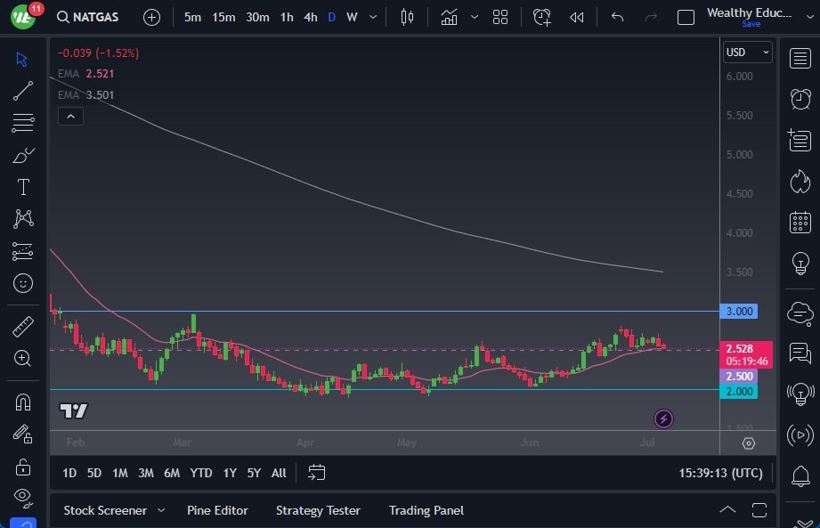 Natural gas markets have done very little during the Thursday trading session, while it looks as if we are simply going to see the market hang around and test the 50-Day EMA. The 50-Day EMA is an indicator that a lot of people pay close attention to, and it is going flat. All things being equal, the market looks as if it is range bound, and the fact that we are in the midst of the summer suggests that we will probably continue to see a lot of back and forth. Alternatively, the time of year is typically somewhat poor for natural gas, due to the fact that heating demand will be almost nonexistent.